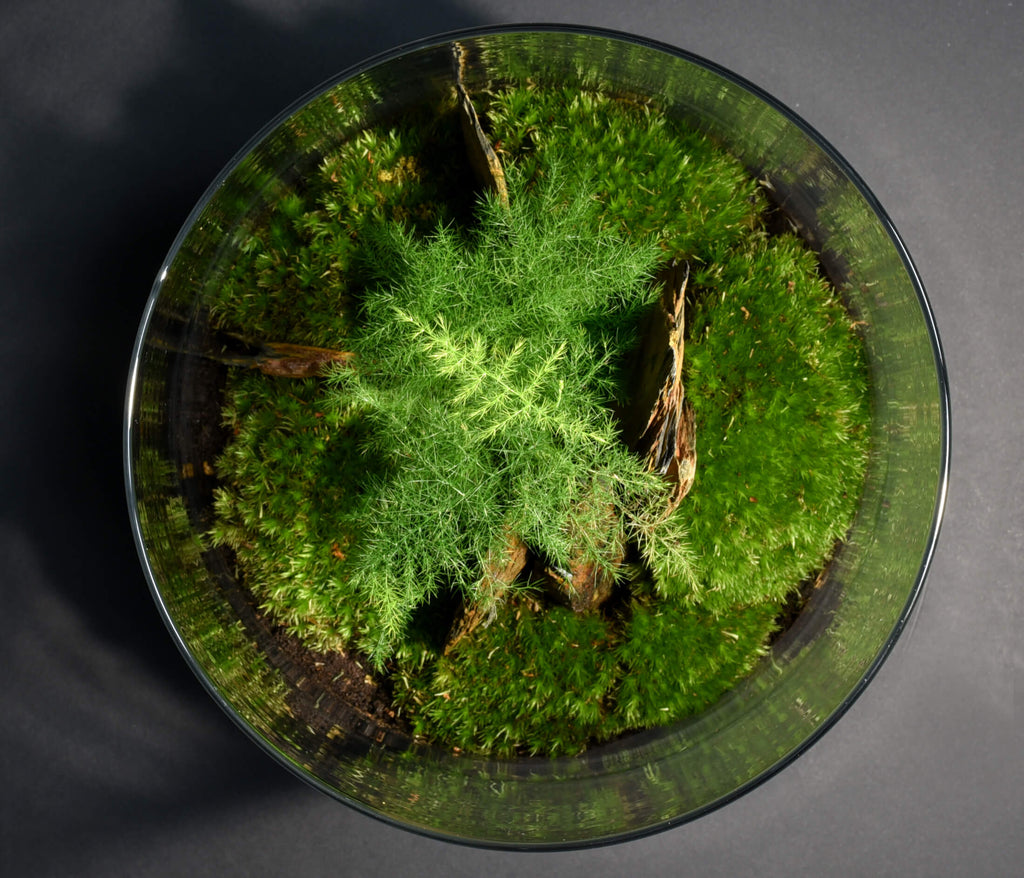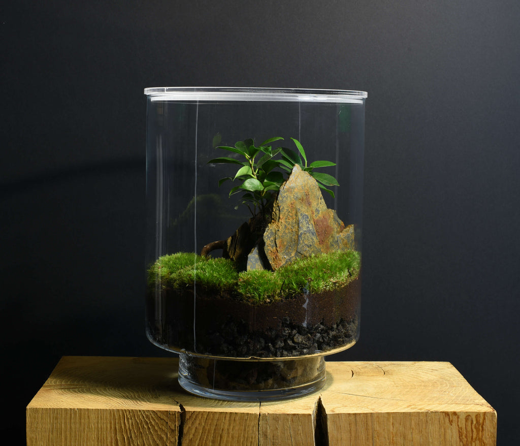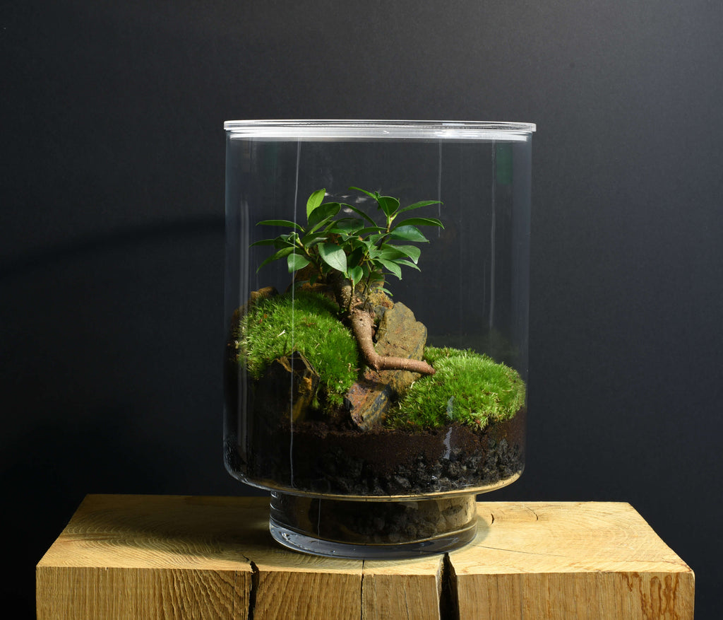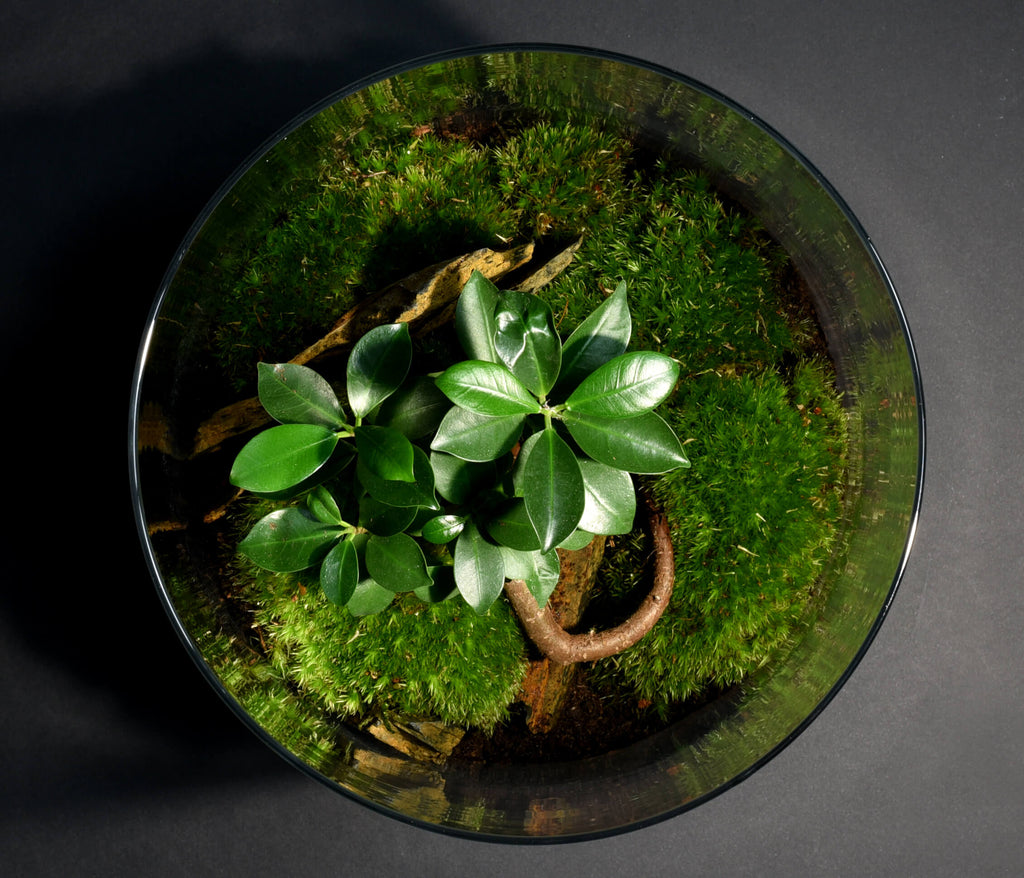 Profitez notamment des racines expressives des ficus pour y inclure des fragments de roche : cette association plante/rocher donnera à votre terrarium une expression de longévité, comme si la plante était née sur ce rocher et l’avait progressivement enlacé avec ses racines !