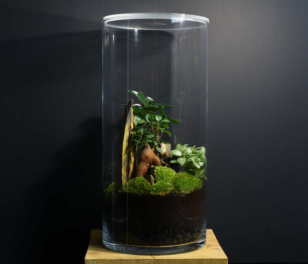 Ce terrarium fait partie de notre gamme de grands modèles, qui en compte 4 différents. Si il a le même diamètre que l’Original #19, il fait presque le double de sa hauteur ! Cela lui donne beaucoup d’élégance et renforce sa présence, sans pour autant prendre plus de surface sur son support.